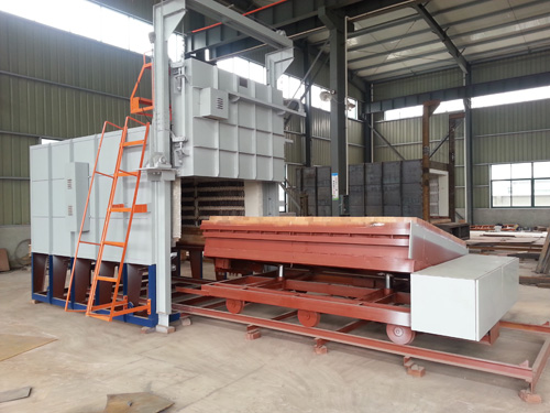 台车框架采用型钢焊接成形,其钢性保证在满负荷下不变形。内用耐火砖砌筑,易碰撞部位和承重部位用重质砖砌筑,增强炉衬结构强度,台车的行走采用自行式结构,由减速机传动链轮带动走轮在轨道上行走。台车密封采用自动迷宫式结构密封,台车进入炉内通过凸轮及滚轮斜面作用,自动升起后进行密封。台车开出,该密封槽自动落下,密封槽内密封砂经加满后即不必经常添加。台车开出,炉门升降均为电动控制,配有电磁制动器,可防止惯性撞击炉体,并且连锁控制,即稍打开炉门后,自动切断加热元件,同时恢复台车行走机构电源。炉门关闭到位后,自动切断台车行走机构电源,同时恢复加热元件电源。