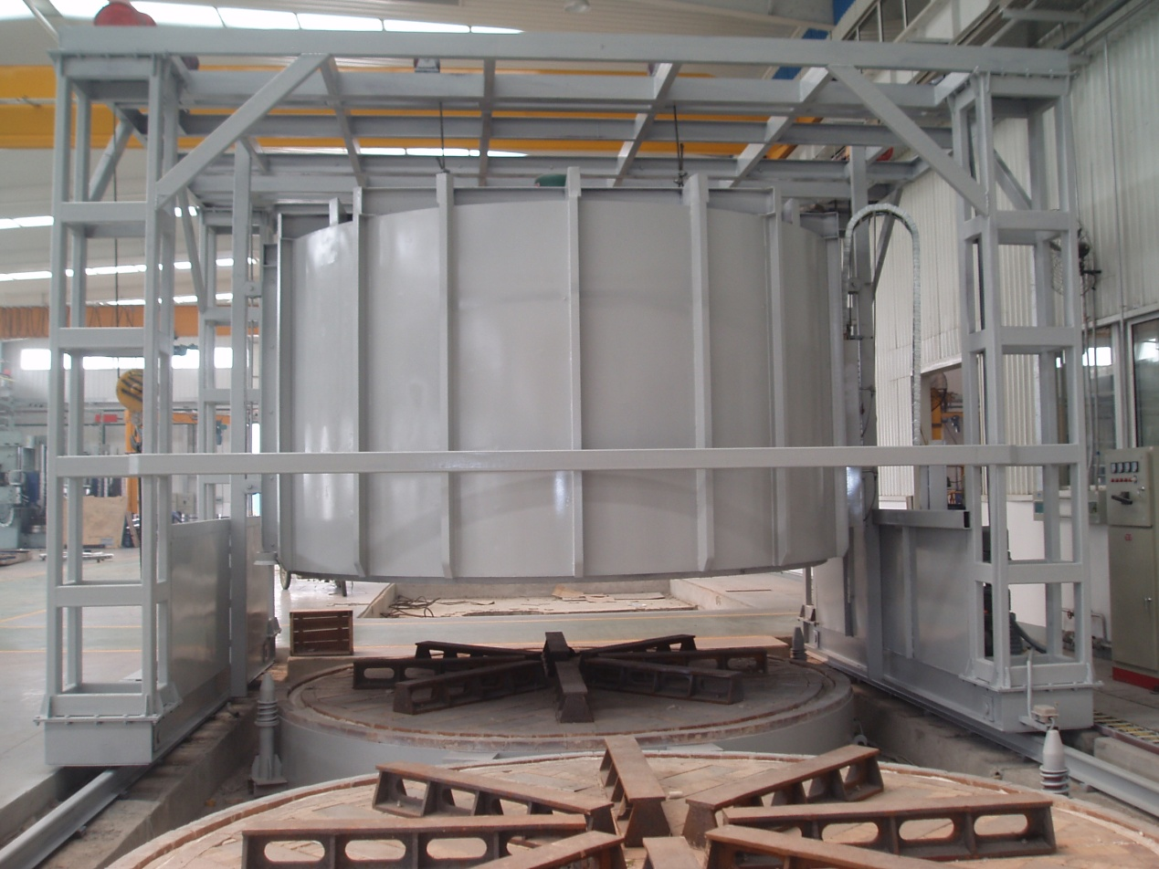 加热罩由钢板卷成园形经焊接加工而成,在罩身的上部有供吊钩起吊换罩的位置,下部有三个支承炉罩的支承脚,底部装有沙封刀,在加热时使加热罩能直接压在炉内罩的法兰上使其达到密封的效果,另在两个导向环,以便加热罩能方便准确地吊放在炉座上。